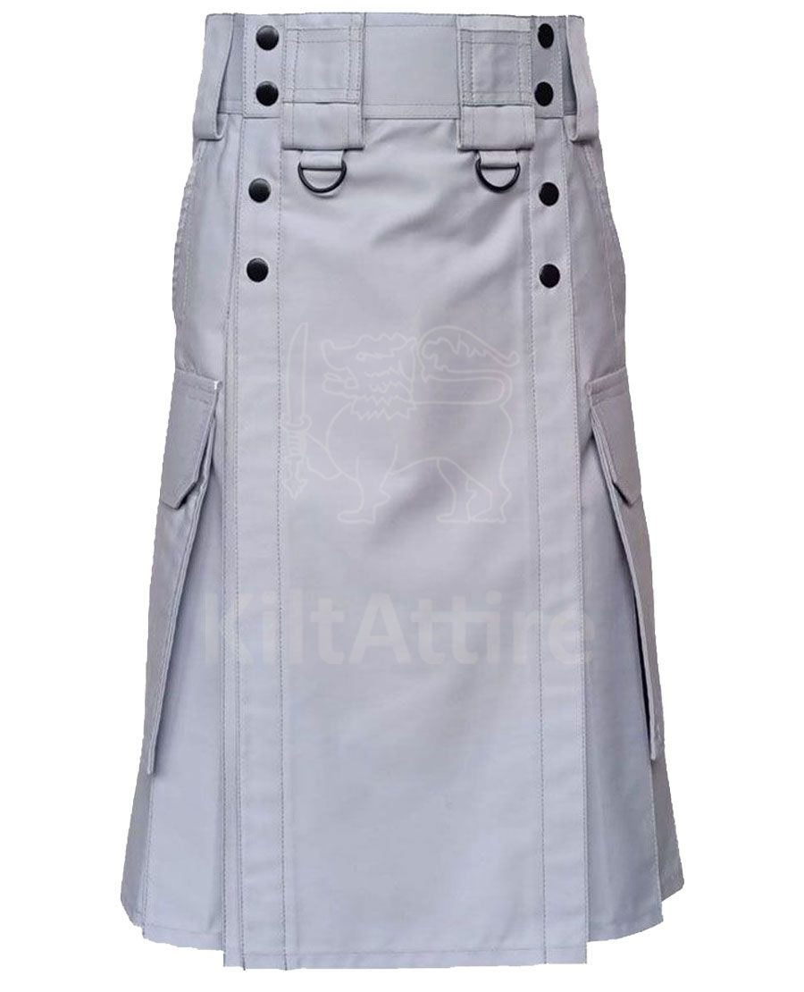 White Utility Kilt are usually made from materials such as Cotton, denim, leather or other hard-wearing fabrics. Utility kilts are made with lightweight and breathable materials such as cotton or poly-cotton blends, making them much more comfortable than traditional pants or jeans. Plus, they allow for a greater range of movement, which is perfect for activities like hiking or working outdoors. Utility Kilts are more than a fashion garment. The pockets can be used for storing small essentials like a wallet, phone, or cigarettes.